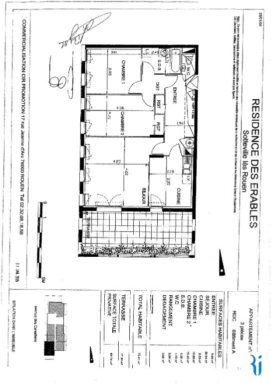 Dans résidence sécurisée, F3 de 72.41 m² en rez-de-chaussée, comprenant : grande entrée avec placard, séjour donnant sur terrasse de 17 m², cuisine aménagée et équipée d'une plaque vitrocéramique, 2 chambres dont 1 avec placard, salle de bains.