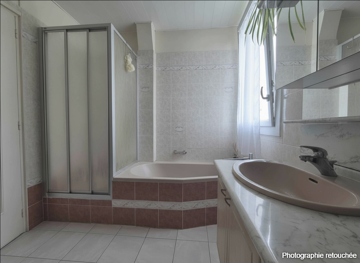 Le dégagement mène à un espace nuit comprenant trois chambres sur parquet ancien et une salle de bains mixte, avec douche et baignoire.
