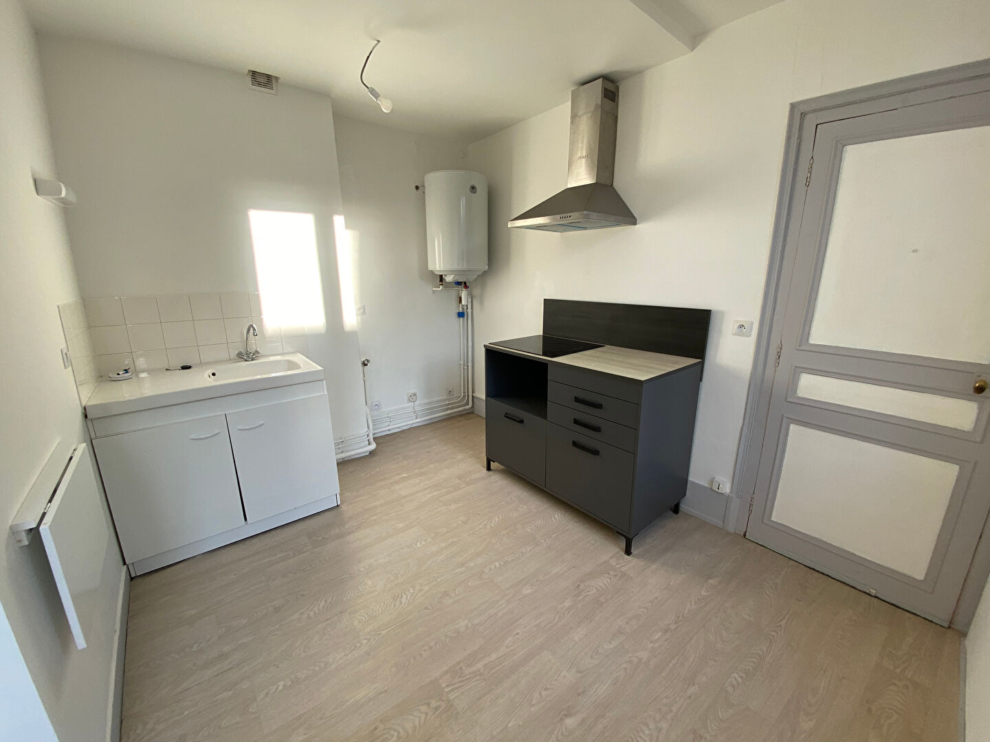 L'appartement possède une cuisine aménagée et équipée d'une plaque de cuisson ainsi que d'une hotte. Une salle de douche avec WC et un grand séjour lumineux.