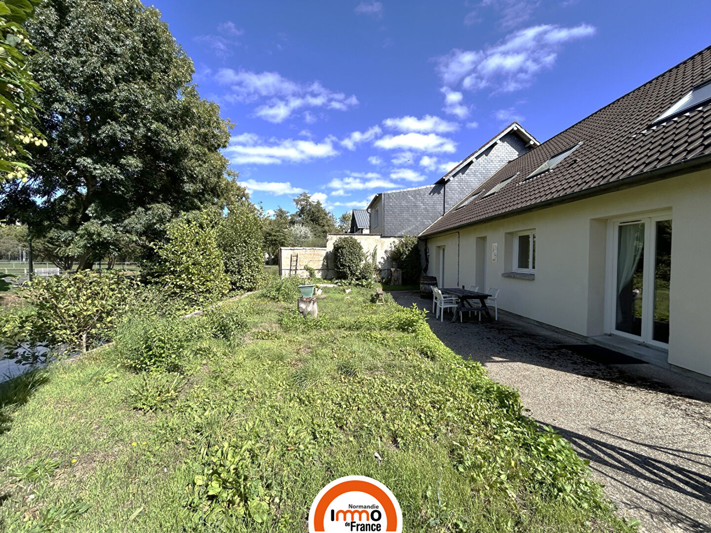L'extérieur se compose d'un espace permettant de stationner plusieurs véhicules d'un côté, et d'un agréable jardin avec terrasse en bord de l'Iton de l'autre, offrant un cadre à la fois pratique et reposant.