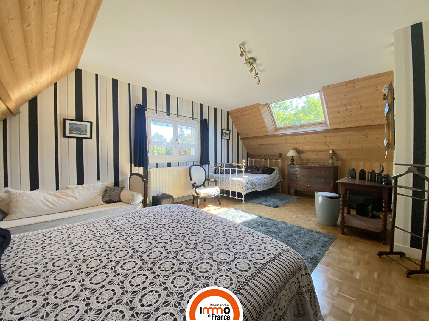 A l'étage, un palier mène à trois grandes chambres dont l'une dispose de son propre cabinet de toilette, une salle d'eau avec WC ainsi qu'un bureau.