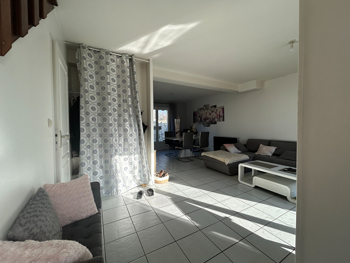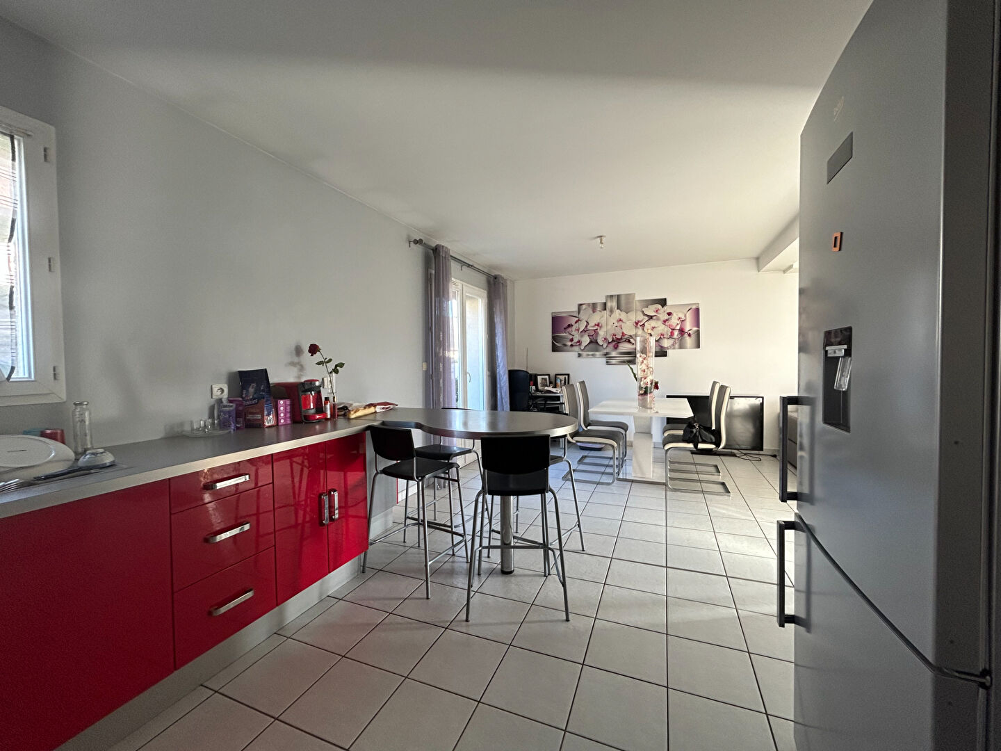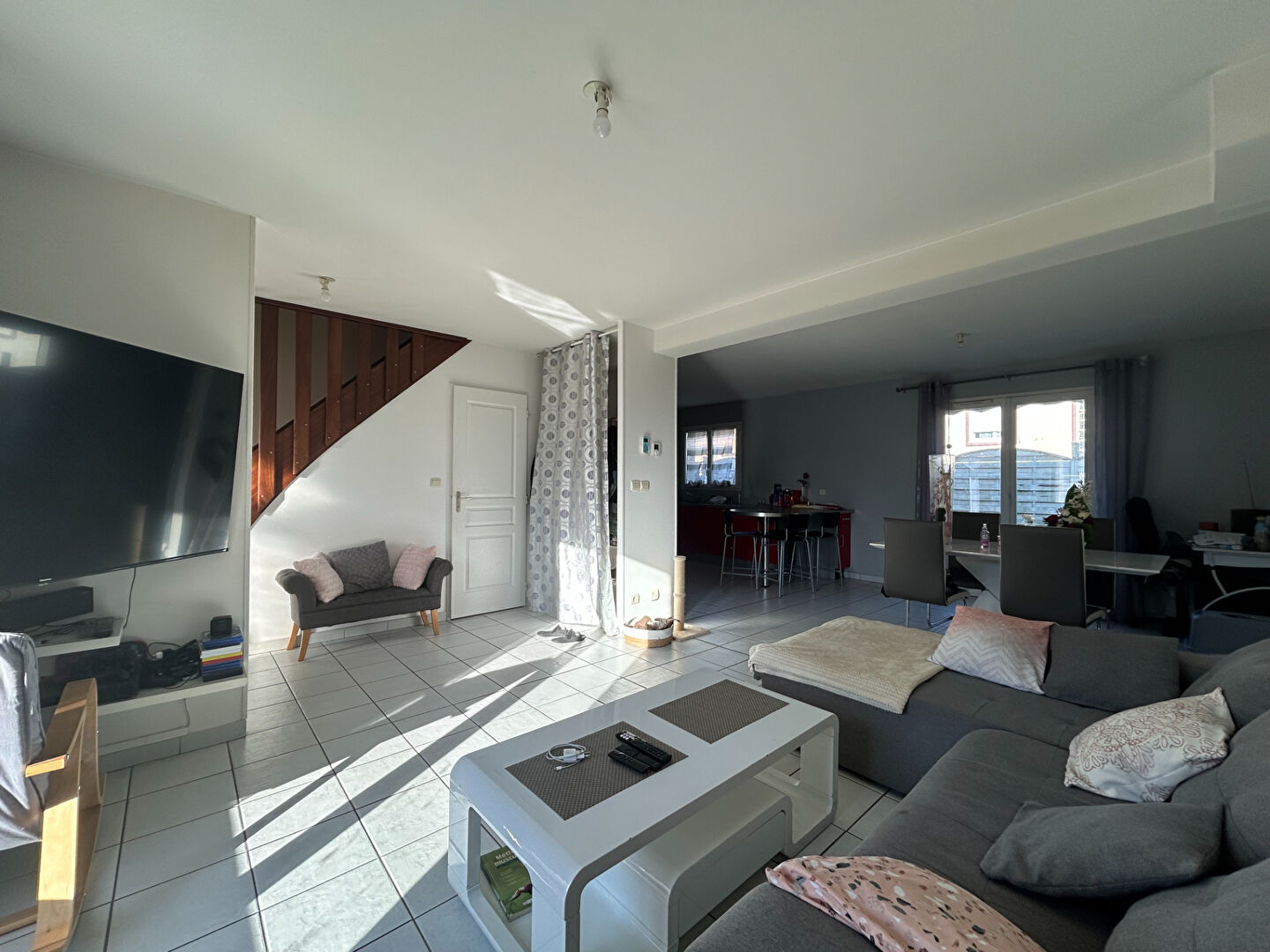 Au rez-de-chaussée, belle pièce de vie avec exposition Est/Ouest, cuisine ouverte, aménagée et moderne.