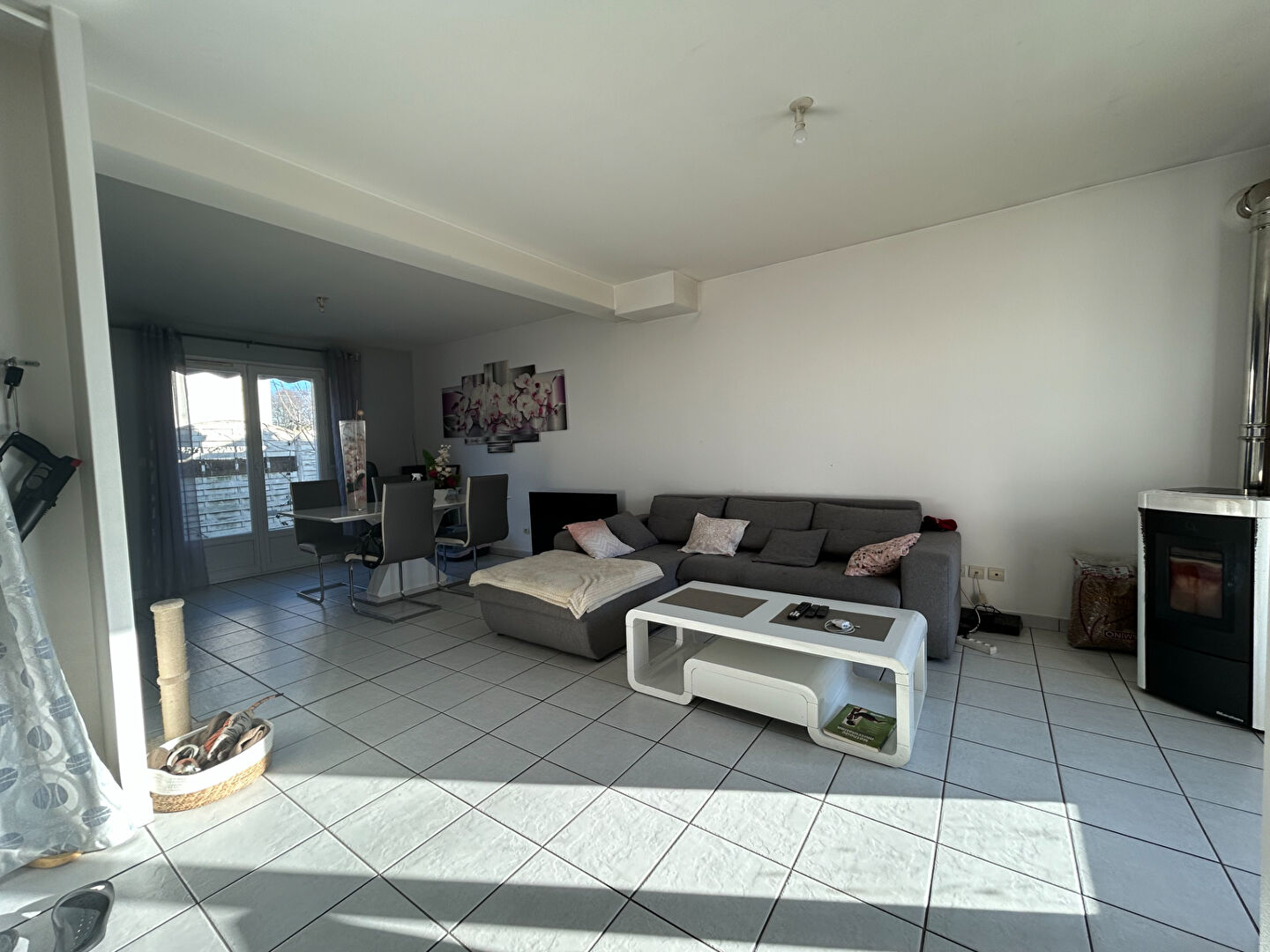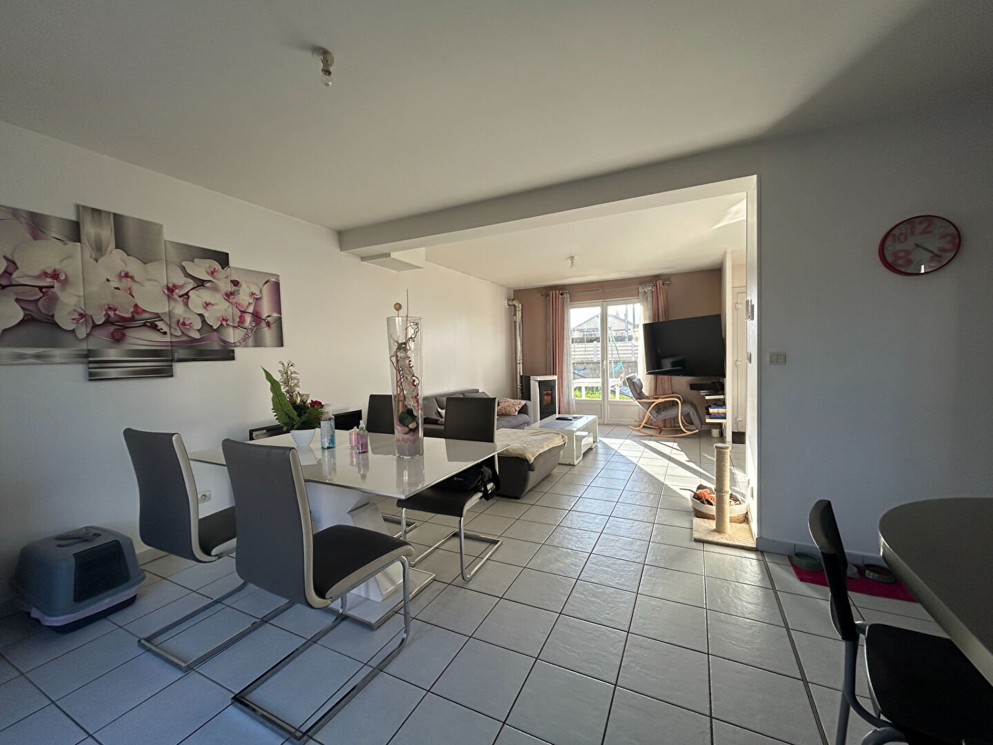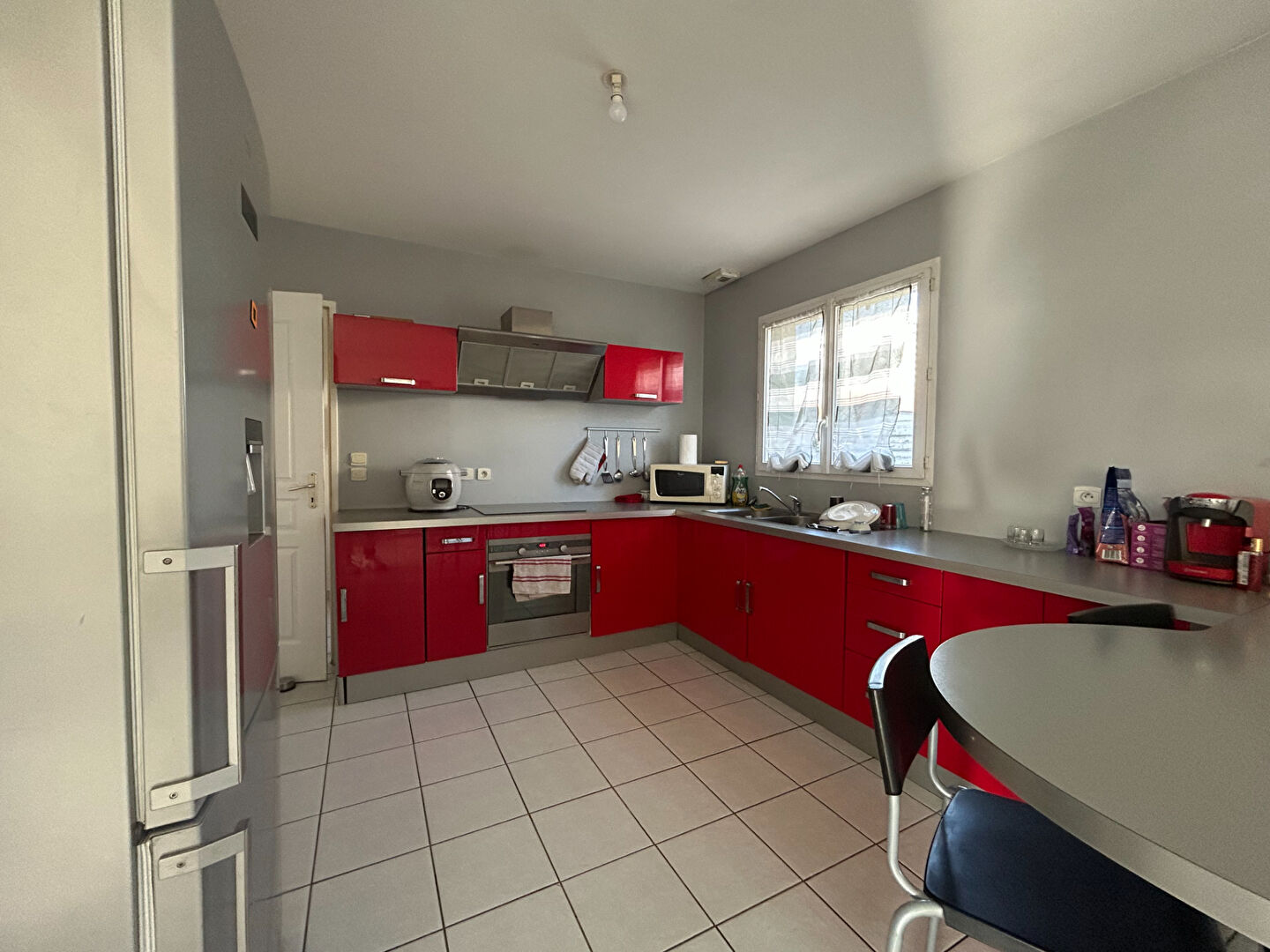 Au rez-de-chaussée, belle pièce de vie avec exposition Est/Ouest, cuisine ouverte, aménagée et moderne.