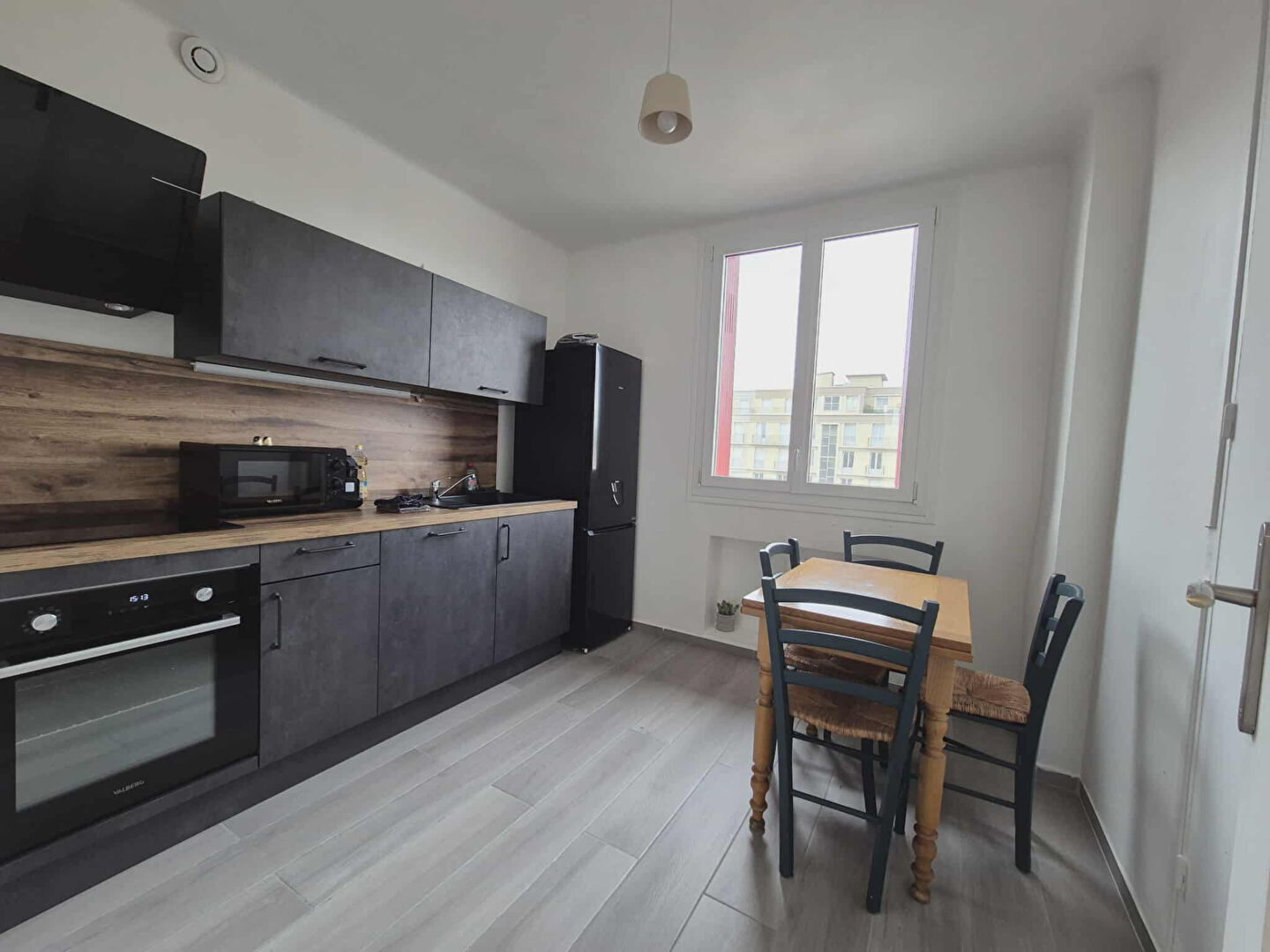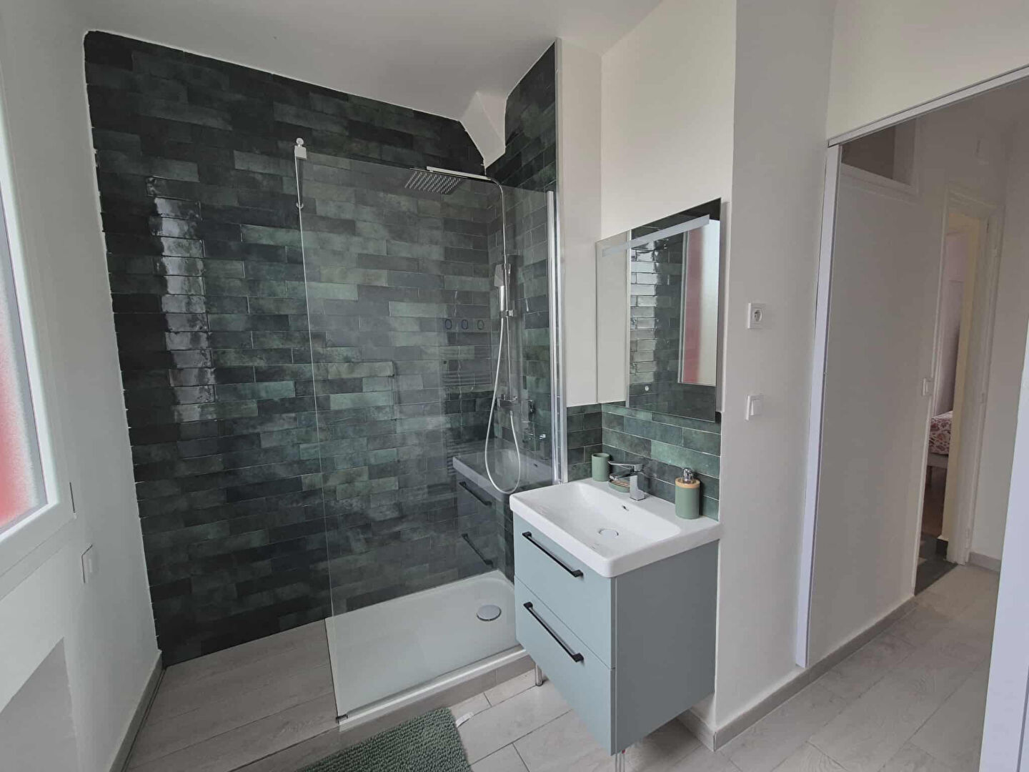 Entrée, cuisine aménagée, salon avec cheminée décorative d'époque et parquet, une chambre, salle d'eau avec rangements.