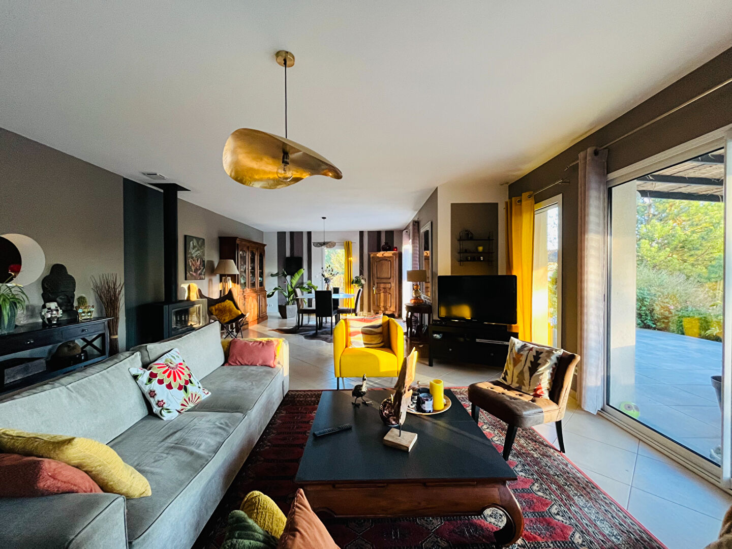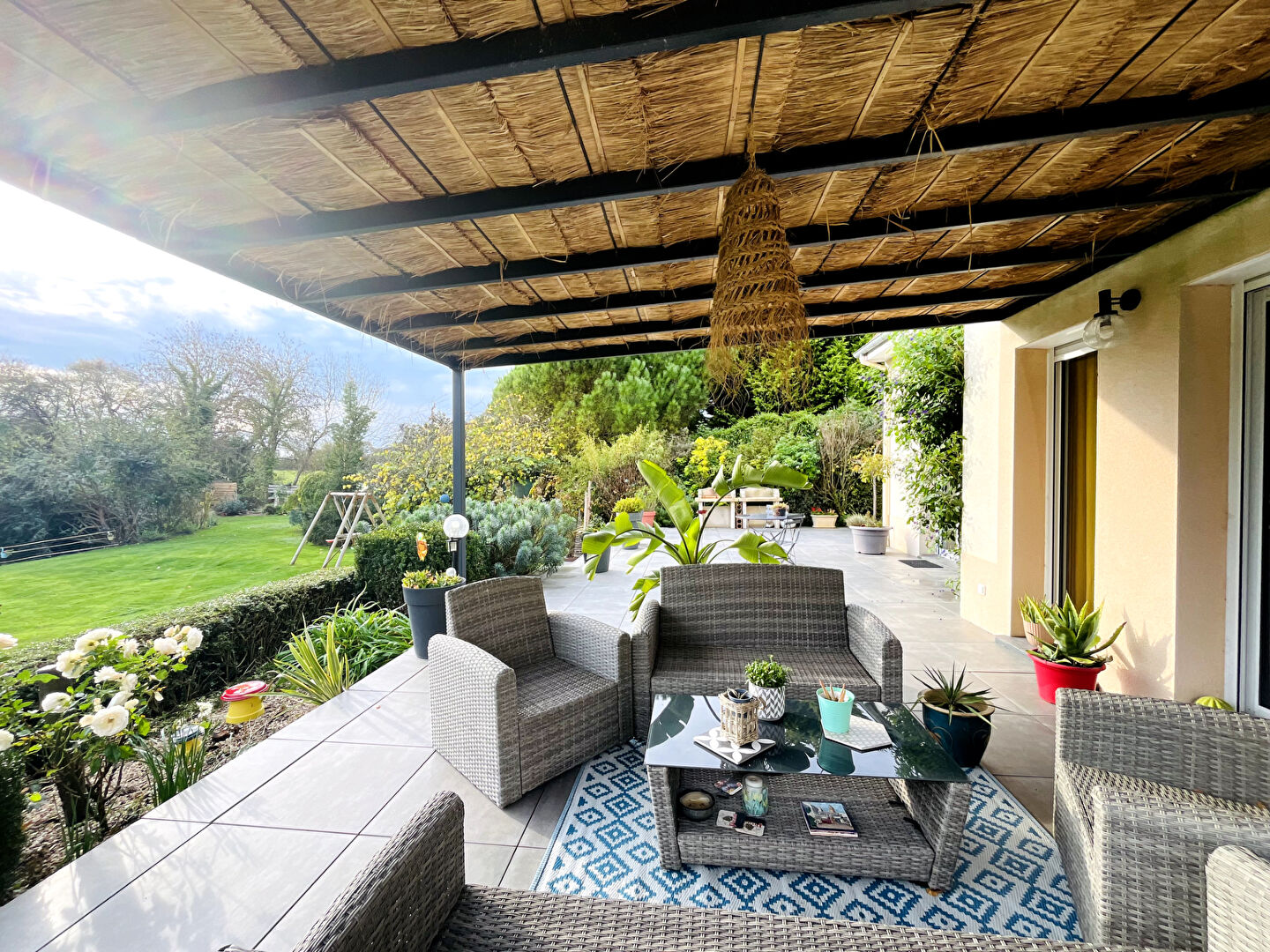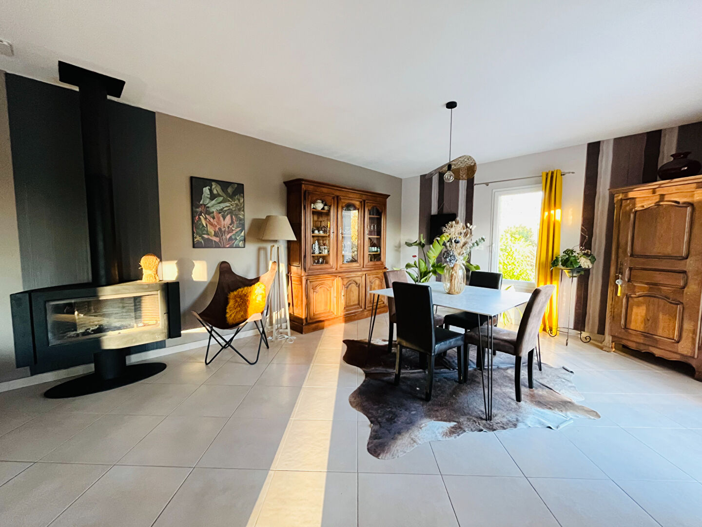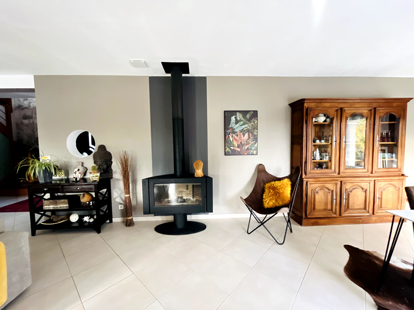 Vie de Plain pied - Pièce de vie lumineuse avec poêle à bois, cuisine aménagée et entièrement équipée, cinq chambres. Cette maison se distingue par ses belles prestations : baie vitrée à galandage, pompe à chaleur, volumes généreux et pièces de vie orientées plein sud pour une luminosité optimale. Le tout est implanté sur un jardin paysagé, soigneusement entretenu.