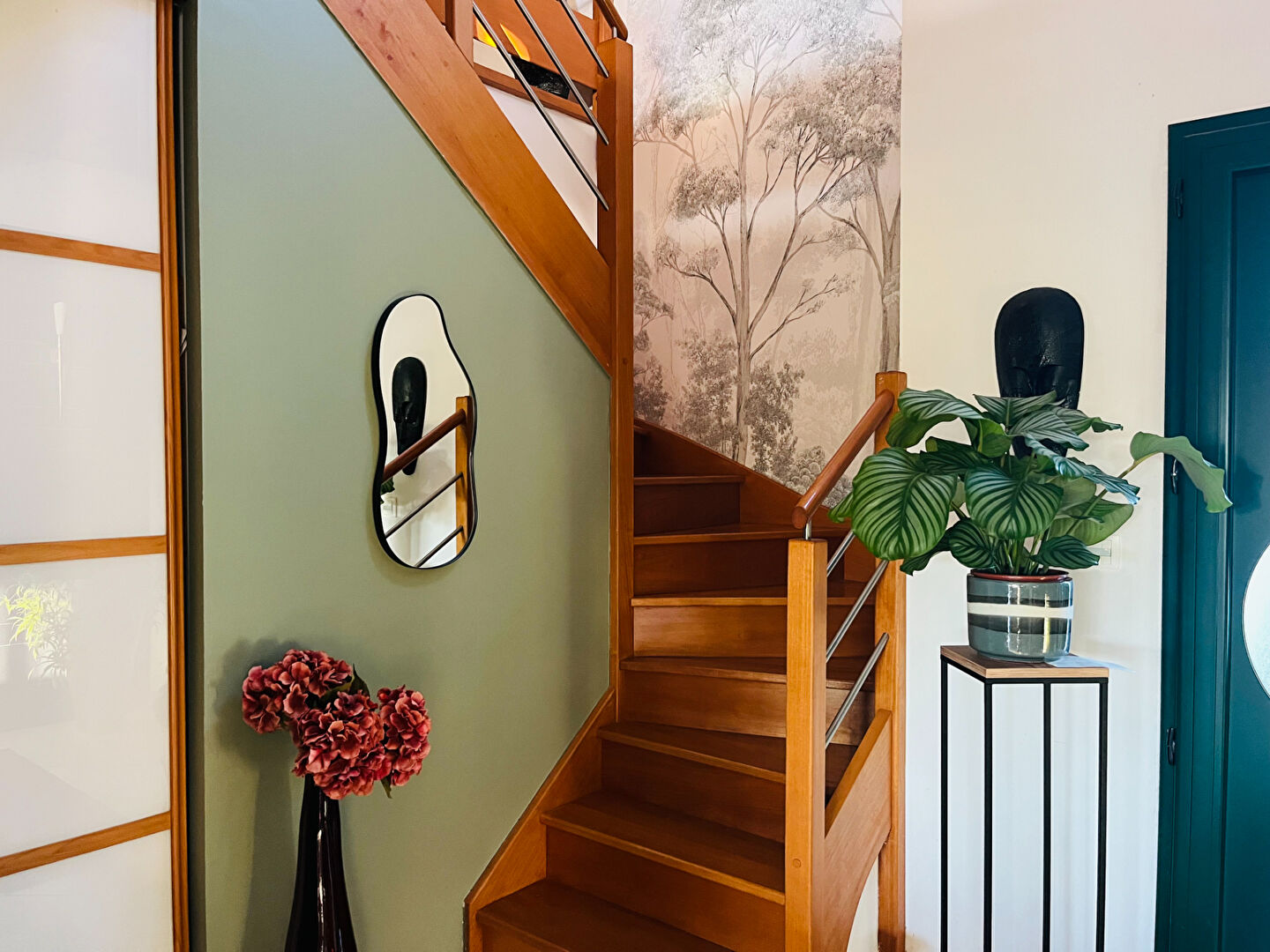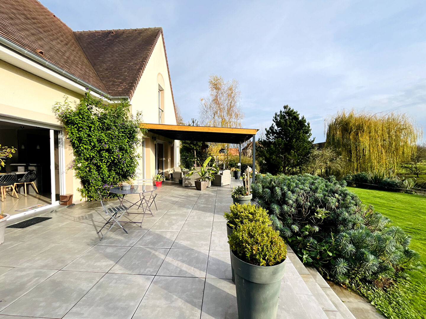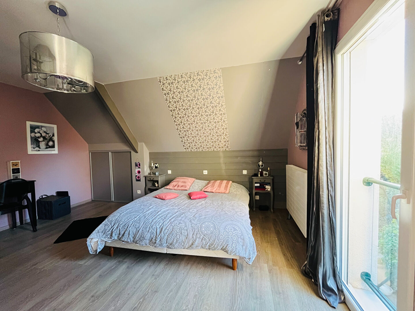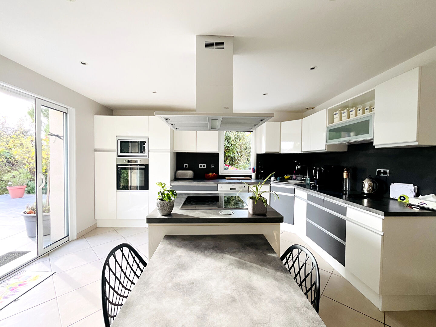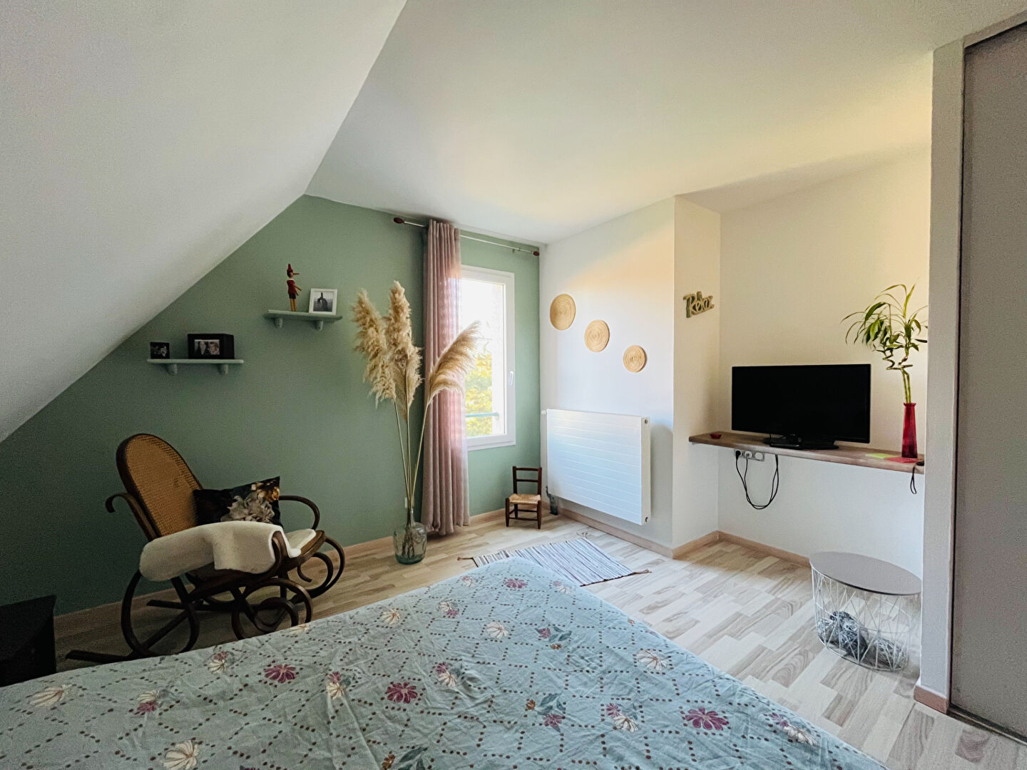 Vie de Plain pied - Pièce de vie lumineuse avec poêle à bois, cuisine aménagée et entièrement équipée, cinq chambres. Cette maison se distingue par ses belles prestations : baie vitrée à galandage, pompe à chaleur, volumes généreux et pièces de vie orientées plein sud pour une luminosité optimale. Le tout est implanté sur un jardin paysagé, soigneusement entretenu.