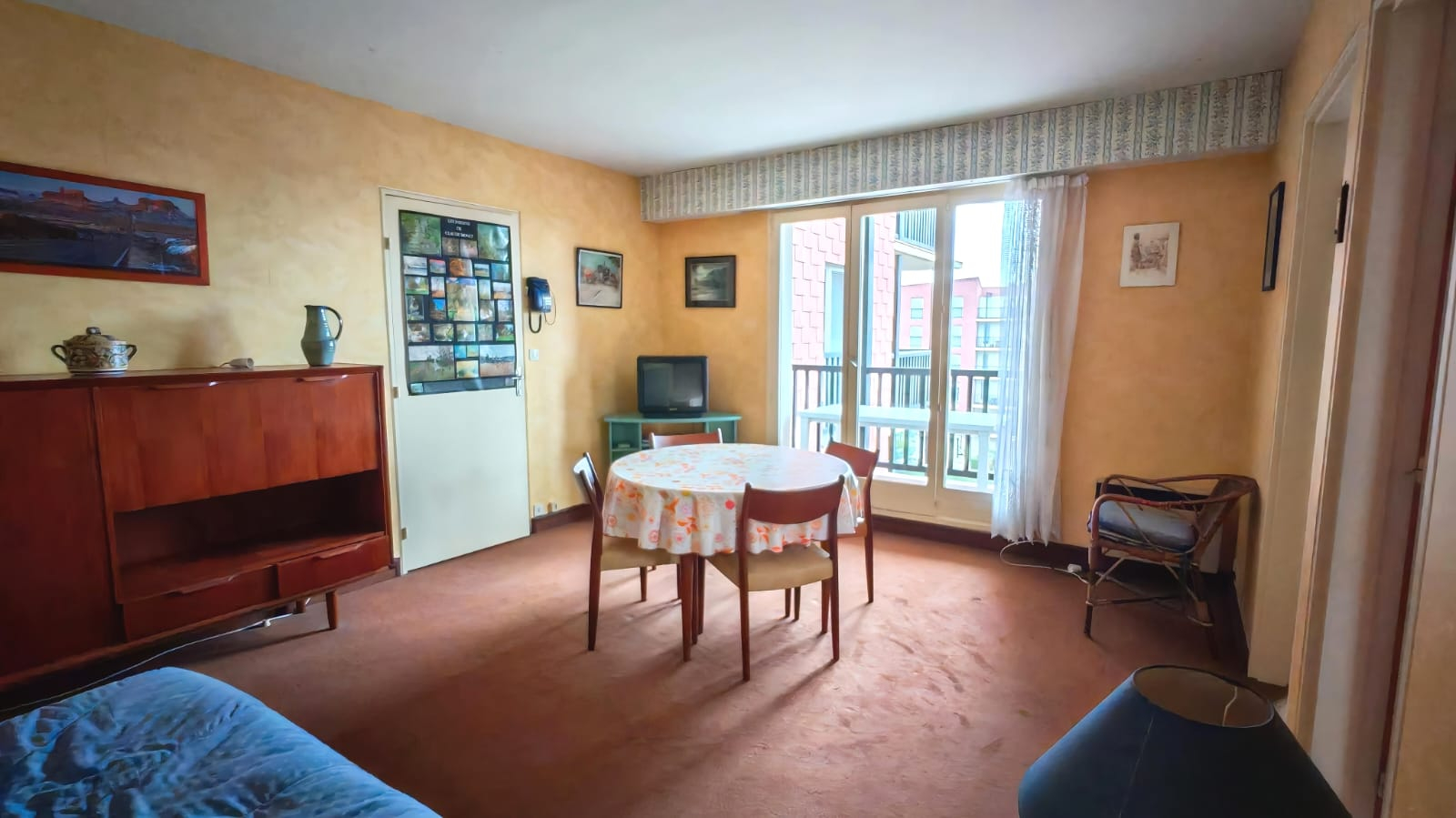 Dans résidence Proche centre-ville et Accès direct plage, Appartement comprenant : Entrée avec placard, salon-séjour donnant sur grande loggia, cuisine aménagée et équipée, une chambre, une salle de bains, un w-c. Belle vue dégagée.