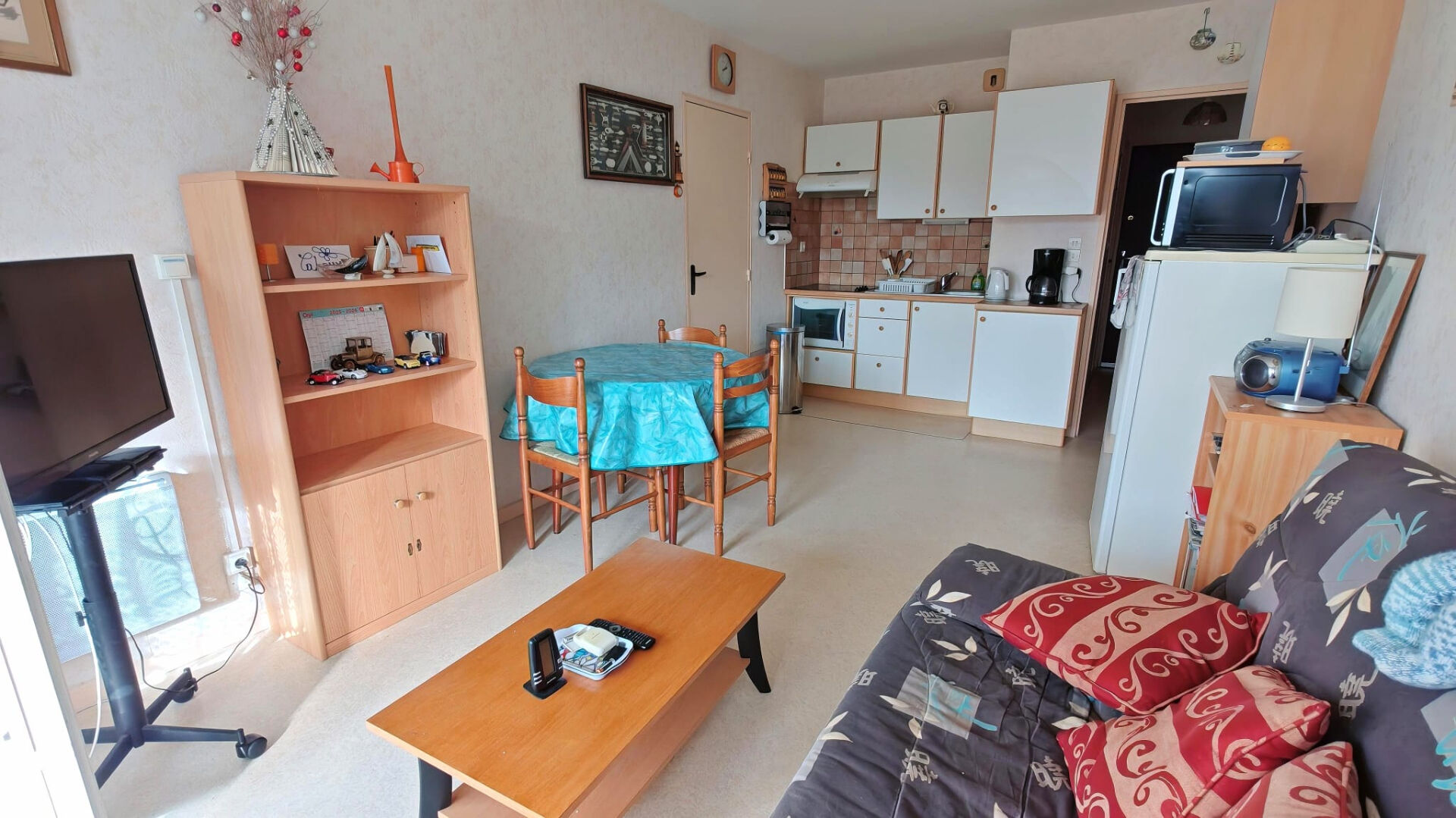 Il se compose d'une entrée avec placard, d'un WC séparé, ainsi que d'une agréable pièce de vie lumineuse exposée Sud-Ouest, avec cuisine ouverte. Cet espace donne accès à une loggia de 6 m².