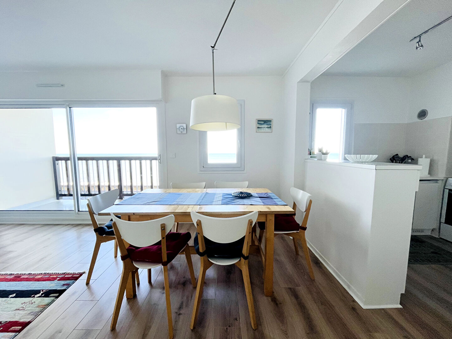 Il se compose d'une belle pièce de vie d'environ 34 m² avec cuisine ouverte aménagée et entièrement équipée, baignée de lumière et bénéficiant d'une superbe vue mer.