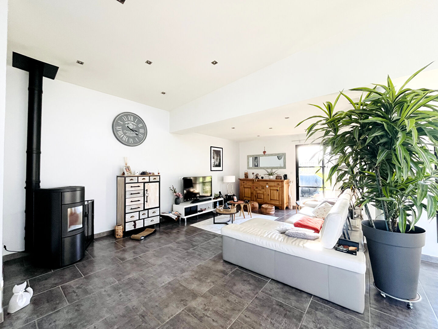 La pièce de vie, d'environ 80 m², bénéficie d'une exposition traversante, d'une belle hauteur sous plafond et d'une cuisine aménagée et entièrement équipée. La partie salon est agrémentée d'un poêle à granulés, apportant confort et chaleur.